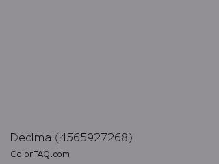 Decimal 4565927268 Color is a normal violet color and the nearest color is Mountain Mist #959396. Hex code #929094 and RGB value is rgb(146,144,148). In RGB color space, this color is composed of 57% red, 56% green, 58% blue, In CMYK color space, this color is composed of 1% cyan, 3% magenta, 0% yellow , 42% black , In HSL color space, this color has a hue angle of 270° , 2% saturation and 57% lightness.