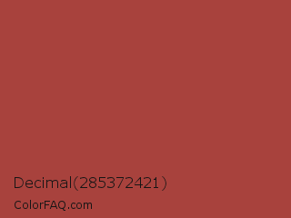 Decimal 285372421 Color is a normal red color and the nearest color is Medium Carmine #af4035. Hex code #a8423d and RGB value is rgb(168,66,61). In RGB color space, this color is composed of 66% red, 26% green, 24% blue, In CMYK color space, this color is composed of 0% cyan, 61% magenta, 64% yellow , 34% black , In HSL color space, this color has a hue angle of 3° , 47% saturation and 45% lightness.