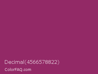 Decimal 4566578822 Color is a normal magenta color and the nearest color is Amaranth Deep Purple #9f2b68. Hex code #932966 and RGB value is rgb(147,41,102). In RGB color space, this color is composed of 58% red, 16% green, 40% blue, In CMYK color space, this color is composed of 0% cyan, 72% magenta, 31% yellow , 42% black , In HSL color space, this color has a hue angle of 325° , 56% saturation and 37% lightness.