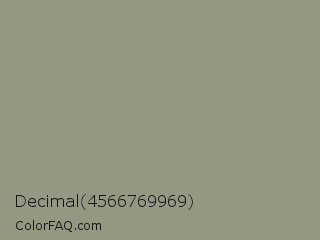 Decimal 4566769969 Color is a normal lime color and the nearest color is Artichoke #8f9779. Hex code #939883 and RGB value is rgb(147,152,131). In RGB color space, this color is composed of 58% red, 60% green, 51% blue, In CMYK color space, this color is composed of 3% cyan, 0% magenta, 14% yellow , 40% black , In HSL color space, this color has a hue angle of 74° , 9% saturation and 55% lightness.