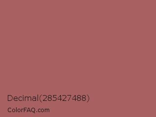 Decimal 285427488 Color is a normal red color and the nearest color is Deep Puce #a95c68. Hex code #a86060 and RGB value is rgb(168,96,96). In RGB color space, this color is composed of 66% red, 38% green, 38% blue, In CMYK color space, this color is composed of 0% cyan, 43% magenta, 43% yellow , 34% black , In HSL color space, this color has a hue angle of 0° , 29% saturation and 52% lightness.