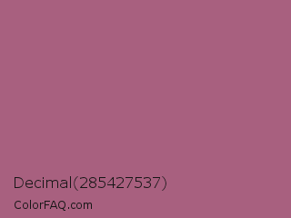 Decimal 285427537 Color is a normal rose color and the nearest color is Tapestry #b05e81. Hex code #a8607f and RGB value is rgb(168,96,127). In RGB color space, this color is composed of 66% red, 38% green, 50% blue, In CMYK color space, this color is composed of 0% cyan, 43% magenta, 24% yellow , 34% black , In HSL color space, this color has a hue angle of 334° , 29% saturation and 52% lightness.