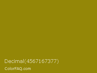 Decimal 4567167377 Color is a dark yellow color and the nearest color is Dark Yellow #9b870c. Hex code #948707 and RGB value is rgb(148,135,7). In RGB color space, this color is composed of 58% red, 53% green, 3% blue, In CMYK color space, this color is composed of 0% cyan, 9% magenta, 95% yellow , 42% black , In HSL color space, this color has a hue angle of 54° , 91% saturation and 30% lightness.