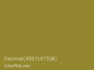 Decimal 4567167538 Color is a normal yellow color and the nearest color is Sycamore #908d39. Hex code #948730 and RGB value is rgb(148,135,48). In RGB color space, this color is composed of 58% red, 53% green, 19% blue, In CMYK color space, this color is composed of 0% cyan, 9% magenta, 68% yellow , 42% black , In HSL color space, this color has a hue angle of 52° , 51% saturation and 38% lightness.