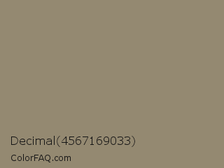 Decimal 4567169033 Color is a normal orange color and the nearest color is Arrowtown #948771. Hex code #948971 and RGB value is rgb(148,137,113). In RGB color space, this color is composed of 58% red, 54% green, 44% blue, In CMYK color space, this color is composed of 0% cyan, 7% magenta, 24% yellow , 42% black , In HSL color space, this color has a hue angle of 41° , 14% saturation and 51% lightness.