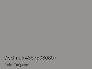 Decimal 4567598080 Color is a normal orange color and the nearest color is Mountain Mist #959396. Hex code #949390 and RGB value is rgb(148,147,144). In RGB color space, this color is composed of 58% red, 58% green, 56% blue, In CMYK color space, this color is composed of 0% cyan, 1% magenta, 3% yellow , 42% black , In HSL color space, this color has a hue angle of 45° , 2% saturation and 57% lightness.
