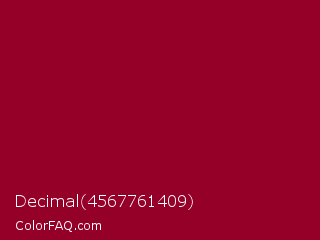 Decimal 4567761409 Color is a dark rose color and the nearest color is Paprika #8d0226. Hex code #950029 and RGB value is rgb(149,0,41). In RGB color space, this color is composed of 58% red, 0% green, 16% blue, In CMYK color space, this color is composed of 0% cyan, 100% magenta, 72% yellow , 42% black , In HSL color space, this color has a hue angle of 343° , 100% saturation and 29% lightness.