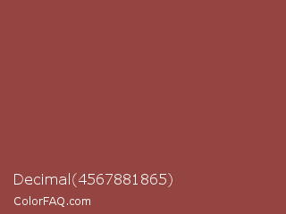 Decimal 4567881865 Color is a normal red color and the nearest color is Copper Rust #944747. Hex code #954541 and RGB value is rgb(149,69,65). In RGB color space, this color is composed of 58% red, 27% green, 25% blue, In CMYK color space, this color is composed of 0% cyan, 54% magenta, 56% yellow , 42% black , In HSL color space, this color has a hue angle of 3° , 39% saturation and 42% lightness.