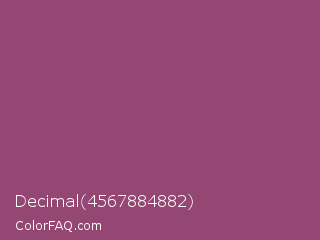 Decimal 4567884882 Color is a normal magenta color and the nearest color is Sugar Plum #914e75. Hex code #954774 and RGB value is rgb(149,71,116). In RGB color space, this color is composed of 58% red, 28% green, 45% blue, In CMYK color space, this color is composed of 0% cyan, 52% magenta, 22% yellow , 42% black , In HSL color space, this color has a hue angle of 325° , 35% saturation and 43% lightness.