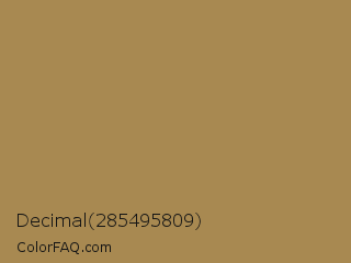 Decimal 285495809 Color is a normal orange color and the nearest color is Limed Oak #ac8a56. Hex code #a88951 and RGB value is rgb(168,137,81). In RGB color space, this color is composed of 66% red, 54% green, 32% blue, In CMYK color space, this color is composed of 0% cyan, 18% magenta, 52% yellow , 34% black , In HSL color space, this color has a hue angle of 39° , 35% saturation and 49% lightness.