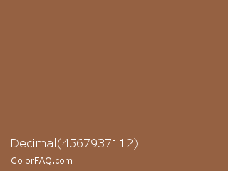 Decimal 4567937112 Color is a normal orange color and the nearest color is Coconut #965a3e. Hex code #956142 and RGB value is rgb(149,97,66). In RGB color space, this color is composed of 58% red, 38% green, 26% blue, In CMYK color space, this color is composed of 0% cyan, 35% magenta, 56% yellow , 42% black , In HSL color space, this color has a hue angle of 22° , 39% saturation and 42% lightness.