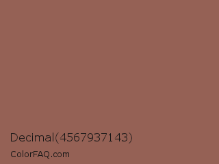 Decimal 4567937143 Color is a normal red color and the nearest color is Au Chico #97605d. Hex code #956155 and RGB value is rgb(149,97,85). In RGB color space, this color is composed of 58% red, 38% green, 33% blue, In CMYK color space, this color is composed of 0% cyan, 35% magenta, 43% yellow , 42% black , In HSL color space, this color has a hue angle of 11° , 27% saturation and 46% lightness.
