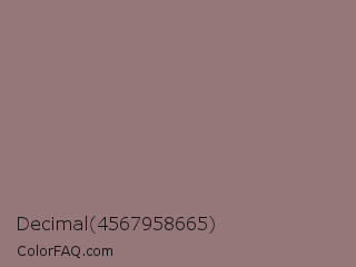 Decimal 4567958665 Color is a normal red color and the nearest color is Bazaar #98777b. Hex code #957679 and RGB value is rgb(149,118,121). In RGB color space, this color is composed of 58% red, 46% green, 47% blue, In CMYK color space, this color is composed of 0% cyan, 21% magenta, 19% yellow , 42% black , In HSL color space, this color has a hue angle of 354° , 13% saturation and 52% lightness.