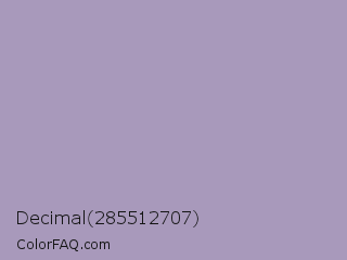 Decimal 285512707 Color is a light violet color and the nearest color is Amethyst Smoke #a397b4. Hex code #a899bb and RGB value is rgb(168,153,187). In RGB color space, this color is composed of 66% red, 60% green, 73% blue, In CMYK color space, this color is composed of 10% cyan, 18% magenta, 0% yellow , 27% black , In HSL color space, this color has a hue angle of 266° , 20% saturation and 67% lightness.