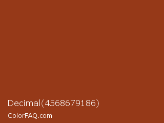 Decimal 4568679186 Color is a normal orange color and the nearest color is Prairie Sand #9a3820. Hex code #963918 and RGB value is rgb(150,57,24). In RGB color space, this color is composed of 59% red, 22% green, 9% blue, In CMYK color space, this color is composed of 0% cyan, 62% magenta, 84% yellow , 41% black , In HSL color space, this color has a hue angle of 16° , 72% saturation and 34% lightness.