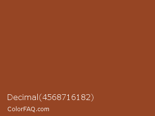 Decimal 4568716182 Color is a normal orange color and the nearest color is Cumin #924321. Hex code #964524 and RGB value is rgb(150,69,36). In RGB color space, this color is composed of 59% red, 27% green, 14% blue, In CMYK color space, this color is composed of 0% cyan, 54% magenta, 76% yellow , 41% black , In HSL color space, this color has a hue angle of 17° , 61% saturation and 36% lightness.