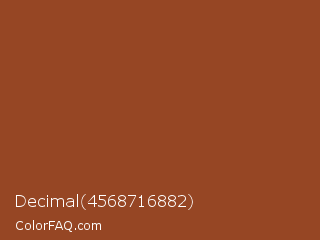 Decimal 4568716882 Color is a normal orange color and the nearest color is Cumin #924321. Hex code #964624 and RGB value is rgb(150,70,36). In RGB color space, this color is composed of 59% red, 27% green, 14% blue, In CMYK color space, this color is composed of 0% cyan, 53% magenta, 76% yellow , 41% black , In HSL color space, this color has a hue angle of 18° , 61% saturation and 36% lightness.