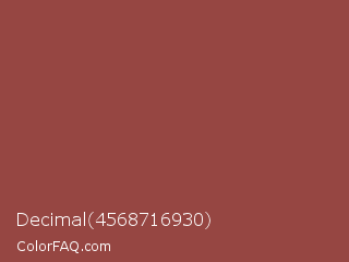 Decimal 4568716930 Color is a normal red color and the nearest color is Copper Rust #944747. Hex code #964642 and RGB value is rgb(150,70,66). In RGB color space, this color is composed of 59% red, 27% green, 26% blue, In CMYK color space, this color is composed of 0% cyan, 53% magenta, 56% yellow , 41% black , In HSL color space, this color has a hue angle of 3° , 39% saturation and 42% lightness.