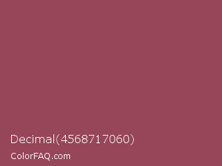 Decimal 4568717060 Color is a normal red color and the nearest color is Vin Rouge #983d61. Hex code #964658 and RGB value is rgb(150,70,88). In RGB color space, this color is composed of 59% red, 27% green, 35% blue, In CMYK color space, this color is composed of 0% cyan, 53% magenta, 41% yellow , 41% black , In HSL color space, this color has a hue angle of 347° , 36% saturation and 43% lightness.