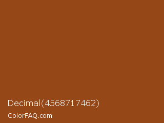 Decimal 4568717462 Color is a normal orange color and the nearest color is Cumin #924321. Hex code #964718 and RGB value is rgb(150,71,24). In RGB color space, this color is composed of 59% red, 28% green, 9% blue, In CMYK color space, this color is composed of 0% cyan, 53% magenta, 84% yellow , 41% black , In HSL color space, this color has a hue angle of 22° , 72% saturation and 34% lightness.