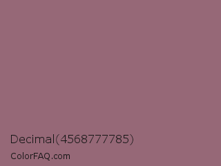 Decimal 4568777785 Color is a normal rose color and the nearest color is Opium #8e6f70. Hex code #966877 and RGB value is rgb(150,104,119). In RGB color space, this color is composed of 59% red, 41% green, 47% blue, In CMYK color space, this color is composed of 0% cyan, 31% magenta, 21% yellow , 41% black , In HSL color space, this color has a hue angle of 340° , 18% saturation and 50% lightness.