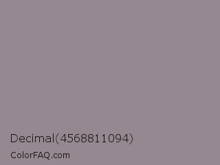 Decimal 4568811094 Color is a normal magenta color and the nearest color is Venus #928590. Hex code #968890 and RGB value is rgb(150,136,144). In RGB color space, this color is composed of 59% red, 53% green, 56% blue, In CMYK color space, this color is composed of 0% cyan, 9% magenta, 4% yellow , 41% black , In HSL color space, this color has a hue angle of 326° , 6% saturation and 56% lightness.