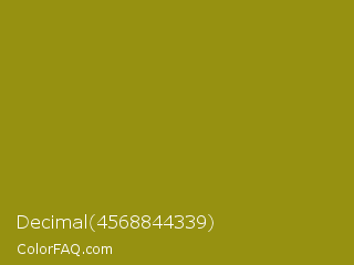 Decimal 4568844339 Color is a normal yellow color and the nearest color is Dark Yellow #9b870c. Hex code #969111 and RGB value is rgb(150,145,17). In RGB color space, this color is composed of 59% red, 57% green, 7% blue, In CMYK color space, this color is composed of 0% cyan, 3% magenta, 89% yellow , 41% black , In HSL color space, this color has a hue angle of 58° , 80% saturation and 33% lightness.