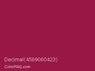 Decimal 4569060423 Color is a normal rose color and the nearest color is Big Dip O Ruby #9c2542. Hex code #971847 and RGB value is rgb(151,24,71). In RGB color space, this color is composed of 59% red, 9% green, 28% blue, In CMYK color space, this color is composed of 0% cyan, 84% magenta, 53% yellow , 41% black , In HSL color space, this color has a hue angle of 338° , 73% saturation and 34% lightness.