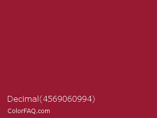 Decimal 4569060994 Color is a normal red color and the nearest color is Vivid Burgundy #9f1d35. Hex code #971932 and RGB value is rgb(151,25,50). In RGB color space, this color is composed of 59% red, 10% green, 20% blue, In CMYK color space, this color is composed of 0% cyan, 83% magenta, 67% yellow , 41% black , In HSL color space, this color has a hue angle of 348° , 72% saturation and 35% lightness.