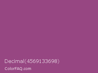 Decimal 4569133698 Color is a normal magenta color and the nearest color is Plum #8e4585. Hex code #974682 and RGB value is rgb(151,70,130). In RGB color space, this color is composed of 59% red, 27% green, 51% blue, In CMYK color space, this color is composed of 0% cyan, 54% magenta, 14% yellow , 41% black , In HSL color space, this color has a hue angle of 316° , 37% saturation and 43% lightness.