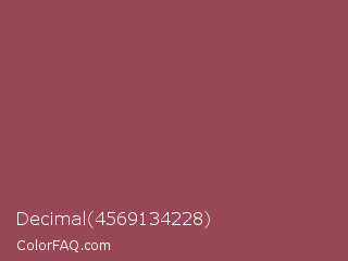 Decimal 4569134228 Color is a normal red color and the nearest color is Vin Rouge #983d61. Hex code #974756 and RGB value is rgb(151,71,86). In RGB color space, this color is composed of 59% red, 28% green, 34% blue, In CMYK color space, this color is composed of 0% cyan, 53% magenta, 43% yellow , 41% black , In HSL color space, this color has a hue angle of 349° , 36% saturation and 44% lightness.