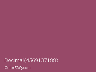Decimal 4569137188 Color is a normal rose color and the nearest color is Twilight Lavender #8a496b. Hex code #974968 and RGB value is rgb(151,73,104). In RGB color space, this color is composed of 59% red, 29% green, 41% blue, In CMYK color space, this color is composed of 0% cyan, 52% magenta, 31% yellow , 41% black , In HSL color space, this color has a hue angle of 336° , 35% saturation and 44% lightness.