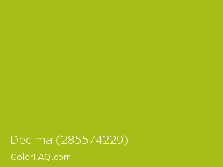 Decimal 285574229 Color is a normal yellow color and the nearest color is Acid Green #b0bf1a. Hex code #a8bd17 and RGB value is rgb(168,189,23). In RGB color space, this color is composed of 66% red, 74% green, 9% blue, In CMYK color space, this color is composed of 11% cyan, 0% magenta, 88% yellow , 26% black , In HSL color space, this color has a hue angle of 68° , 78% saturation and 42% lightness.