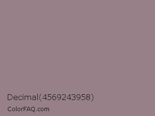 Decimal 4569243958 Color is a normal rose color and the nearest color is Mountbatten Pink #997a8d. Hex code #978088 and RGB value is rgb(151,128,136). In RGB color space, this color is composed of 59% red, 50% green, 53% blue, In CMYK color space, this color is composed of 0% cyan, 15% magenta, 10% yellow , 41% black , In HSL color space, this color has a hue angle of 339° , 10% saturation and 55% lightness.