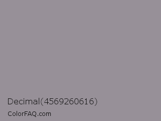 Decimal 4569260616 Color is a normal magenta color and the nearest color is Mountain Mist #959396. Hex code #979098 and RGB value is rgb(151,144,152). In RGB color space, this color is composed of 59% red, 56% green, 60% blue, In CMYK color space, this color is composed of 1% cyan, 5% magenta, 0% yellow , 40% black , In HSL color space, this color has a hue angle of 293° , 4% saturation and 58% lightness.