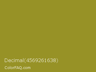 Decimal 4569261638 Color is a normal yellow color and the nearest color is Luxor Gold #a7882c. Hex code #979226 and RGB value is rgb(151,146,38). In RGB color space, this color is composed of 59% red, 57% green, 15% blue, In CMYK color space, this color is composed of 0% cyan, 3% magenta, 75% yellow , 41% black , In HSL color space, this color has a hue angle of 57° , 60% saturation and 37% lightness.
