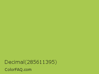 Decimal 285611395 Color is a normal lime color and the nearest color is Middle Green Yellow #acbf60. Hex code #a8c94f and RGB value is rgb(168,201,79). In RGB color space, this color is composed of 66% red, 79% green, 31% blue, In CMYK color space, this color is composed of 16% cyan, 0% magenta, 61% yellow , 21% black , In HSL color space, this color has a hue angle of 76° , 53% saturation and 55% lightness.