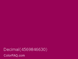 Decimal 4569846630 Color is a dark magenta color and the nearest color is Cardinal Pink #8c055e. Hex code #980256 and RGB value is rgb(152,2,86). In RGB color space, this color is composed of 60% red, 1% green, 34% blue, In CMYK color space, this color is composed of 0% cyan, 99% magenta, 43% yellow , 40% black , In HSL color space, this color has a hue angle of 326° , 97% saturation and 30% lightness.