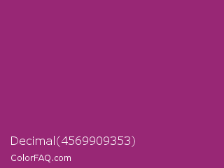 Decimal 4569909353 Color is a normal magenta color and the nearest color is Amaranth Deep Purple #9f2b68. Hex code #982775 and RGB value is rgb(152,39,117). In RGB color space, this color is composed of 60% red, 15% green, 46% blue, In CMYK color space, this color is composed of 0% cyan, 74% magenta, 23% yellow , 40% black , In HSL color space, this color has a hue angle of 319° , 59% saturation and 37% lightness.