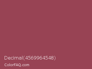 Decimal 4569964548 Color is a normal red color and the nearest color is Copper Rust #944747. Hex code #984354 and RGB value is rgb(152,67,84). In RGB color space, this color is composed of 60% red, 26% green, 33% blue, In CMYK color space, this color is composed of 0% cyan, 56% magenta, 45% yellow , 40% black , In HSL color space, this color has a hue angle of 348° , 39% saturation and 43% lightness.