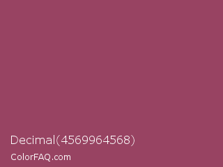 Decimal 4569964568 Color is a normal rose color and the nearest color is Vin Rouge #983d61. Hex code #984362 and RGB value is rgb(152,67,98). In RGB color space, this color is composed of 60% red, 26% green, 38% blue, In CMYK color space, this color is composed of 0% cyan, 56% magenta, 36% yellow , 40% black , In HSL color space, this color has a hue angle of 338° , 39% saturation and 43% lightness.