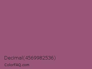 Decimal 4569982536 Color is a normal rose color and the nearest color is Sugar Plum #914e75. Hex code #985578 and RGB value is rgb(152,85,120). In RGB color space, this color is composed of 60% red, 33% green, 47% blue, In CMYK color space, this color is composed of 0% cyan, 44% magenta, 21% yellow , 40% black , In HSL color space, this color has a hue angle of 329° , 28% saturation and 46% lightness.