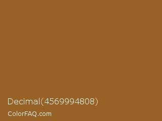 Decimal 4569994808 Color is a normal orange color and the nearest color is Kumera #886221. Hex code #986126 and RGB value is rgb(152,97,38). In RGB color space, this color is composed of 60% red, 38% green, 15% blue, In CMYK color space, this color is composed of 0% cyan, 36% magenta, 75% yellow , 40% black , In HSL color space, this color has a hue angle of 31° , 60% saturation and 37% lightness.