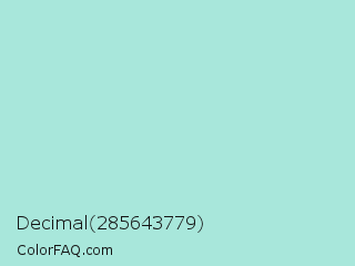 Decimal 285643779 Color is a light cyan color and the nearest color is Water Leaf #a1e9de. Hex code #a8e7db and RGB value is rgb(168,231,219). In RGB color space, this color is composed of 66% red, 91% green, 86% blue, In CMYK color space, this color is composed of 27% cyan, 0% magenta, 5% yellow , 9% black , In HSL color space, this color has a hue angle of 169° , 57% saturation and 78% lightness.