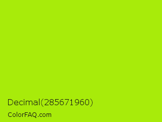 Decimal 285671960 Color is a normal lime color and the nearest color is Inch Worm #b0e313. Hex code #a8eb0a and RGB value is rgb(168,235,10). In RGB color space, this color is composed of 66% red, 92% green, 4% blue, In CMYK color space, this color is composed of 29% cyan, 0% magenta, 96% yellow , 8% black , In HSL color space, this color has a hue angle of 78° , 92% saturation and 48% lightness.