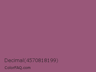 Decimal 4570818199 Color is a normal rose color and the nearest color is Sugar Plum #914e75. Hex code #995779 and RGB value is rgb(153,87,121). In RGB color space, this color is composed of 60% red, 34% green, 47% blue, In CMYK color space, this color is composed of 0% cyan, 43% magenta, 21% yellow , 40% black , In HSL color space, this color has a hue angle of 329° , 28% saturation and 47% lightness.