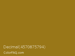 Decimal 4570875794 Color is a normal orange color and the nearest color is Sand Dune #967117. Hex code #997718 and RGB value is rgb(153,119,24). In RGB color space, this color is composed of 60% red, 47% green, 9% blue, In CMYK color space, this color is composed of 0% cyan, 22% magenta, 84% yellow , 40% black , In HSL color space, this color has a hue angle of 44° , 73% saturation and 35% lightness.