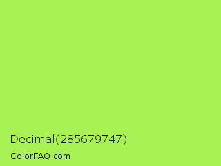 Decimal 285679747 Color is a light green color and the nearest color is Inchworm #b2ec5d. Hex code #a8f253 and RGB value is rgb(168,242,83). In RGB color space, this color is composed of 66% red, 95% green, 33% blue, In CMYK color space, this color is composed of 31% cyan, 0% magenta, 66% yellow , 5% black , In HSL color space, this color has a hue angle of 88° , 86% saturation and 64% lightness.