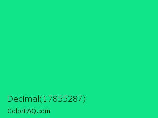 Decimal 17855287 Color is a normal green color and the nearest color is Medium Spring Green #00fa9a. Hex code #10e589 and RGB value is rgb(16,229,137). In RGB color space, this color is composed of 6% red, 90% green, 54% blue, In CMYK color space, this color is composed of 93% cyan, 0% magenta, 40% yellow , 10% black , In HSL color space, this color has a hue angle of 154° , 87% saturation and 48% lightness.