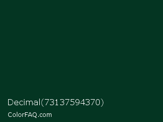 Decimal 73137594370 Color is a very dark green color and the nearest color is Dark Green #013220. Hex code #043522 and RGB value is rgb(4,53,34). In RGB color space, this color is composed of 2% red, 21% green, 13% blue, In CMYK color space, this color is composed of 92% cyan, 0% magenta, 36% yellow , 79% black , In HSL color space, this color has a hue angle of 157° , 86% saturation and 11% lightness.